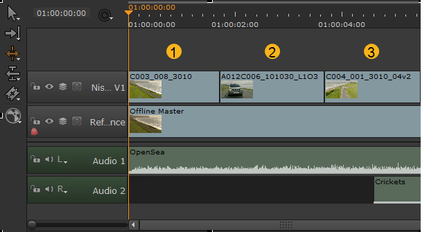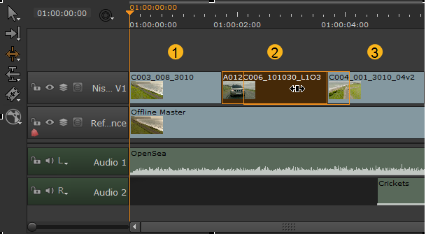 例如,如果将目标镜头(2)向右滑动五帧,则前一项(1)将在五帧之后结束,而下一项(3)将在五帧后开始。